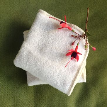 Made of organic bamboo loop terry on one side and organic hemp fleece on the other creating extra softness. The washcloths are white/ivory and are hand made in Ohio.